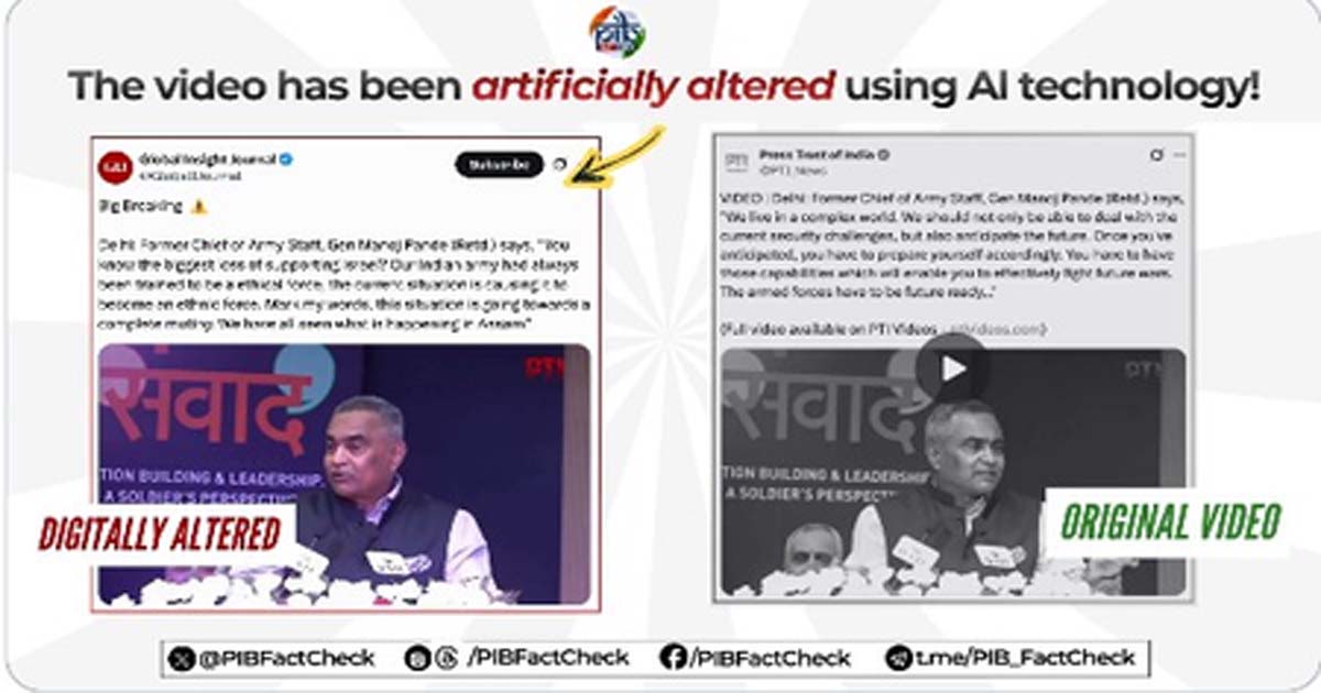 पीआईबी फैक्ट चेक ने एआई से बनाई गई फेक वीडियो और ओरिजिनल वीडियो लगाकर सावधान रहने की अपील की और कहा, “सावधान! यह एक एआई-जनरेटेड डीपफेक वीडियो है। पूर्व आर्मी चीफ जनरल मनोज पांडे (रिटायर्ड) ने ऐसा कोई बयान नहीं दिया है। पाकिस्तानी प्रोपेगेंडा अकाउंट्स ऐसे मैनिपुलेटेड वीडियो को एक कोऑर्डिनेटेड डिसइन्फॉर्मेशन कैंपेन के हिस्से के तौर पर सर्कुलेट कर रहे हैं ताकि जनता को गुमराह किया जा सके और भारतीय सेना पर भरोसा कम किया जा सके। जानकारी साझा करने से पहले हमेशा आधिकारिक और भरोसेमंद सोर्स से जानकारी सत्यापित करें।”